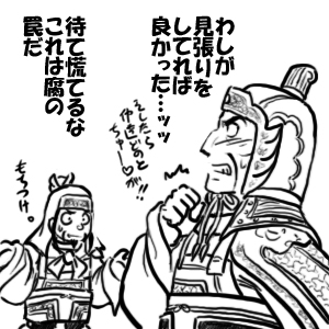 敗退し、罪を問われるものと覚悟してうなだれた張郃さんが司馬懿に許され