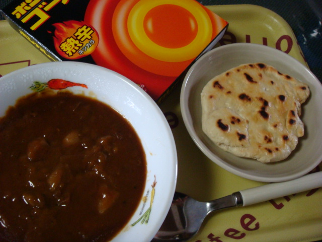 お昼は簡単にレトルトカレーw以前に作って冷凍したナンをお供に。
