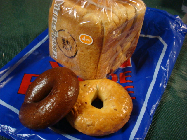 手前の葉、お昼用の黒糖ベーグルと豆乳ベーグル。