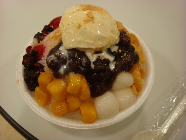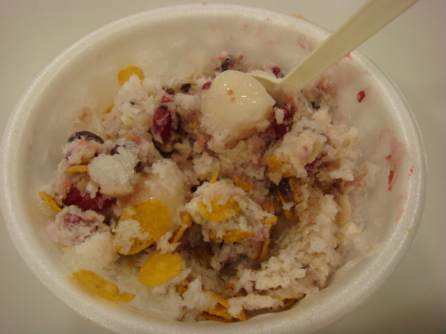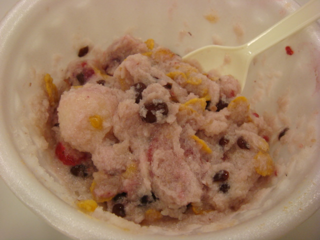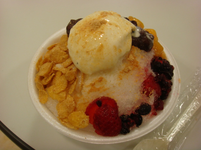 氷、バニラアイス、ベリー類やマンゴー、小豆、白玉、コーンフレークが渾然一体となった、