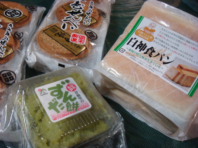ずんだ餅(宮城)(仕分け途中)、南部せんべい(岩手)、パン(秋田)。