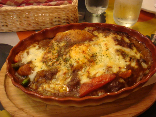 柔らかい牛肉がたくさんごろごろ入った具だくさんカレー+目玉焼き+チーズ!!