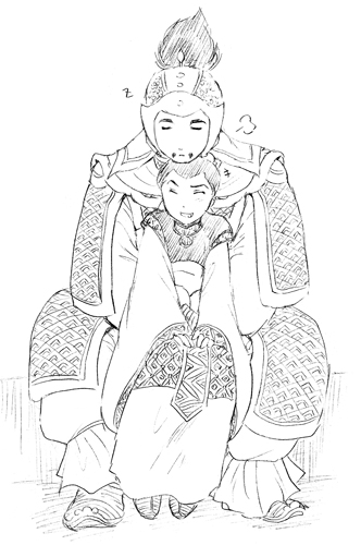 「余を抱いたまま寝こけるとは…良い度胸だのう」と苦笑いしつつも、