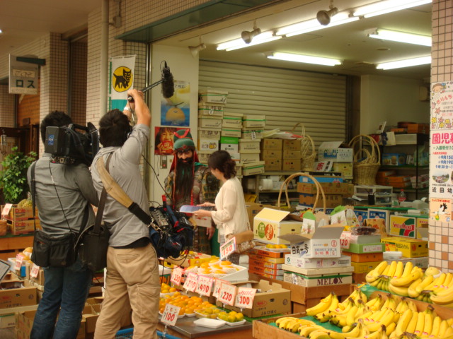 下段左:果物屋さん内で、TV取材を受ける関将軍(笑)