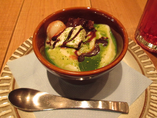 とろんとろんのプリンに、抹茶ソースとチョコソース、