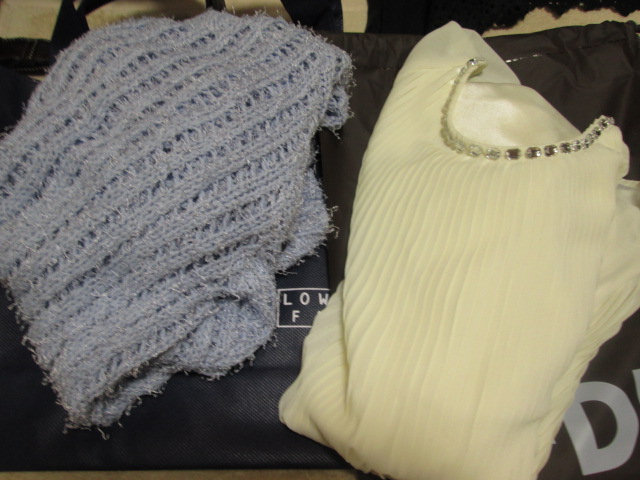 涼しげな色のサマーニット、ビジュー付きプリーツのブラウス。