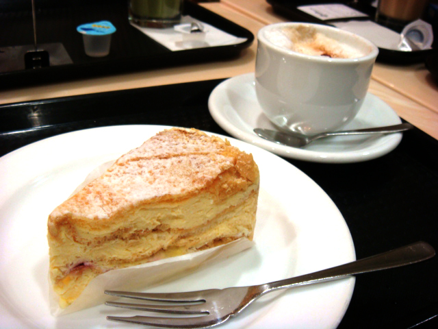 シュー生地のカスタードケーキ、カフェラテ。