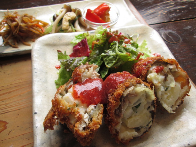 カラッと揚がった鰯フライ、なんとポテサラと大葉が巻かれています!