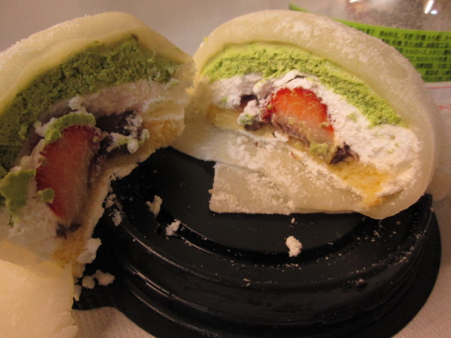 求肥、抹茶クリーム、ホイップ、苺1/2、粒あん、スポンジと色々入ってます!