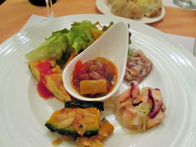 前菜は、グリーンサラダ・豚肉のにこごり・タコのオレンジ風味のマリネ
