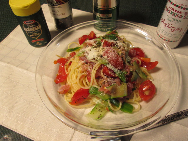 バジルリーフなんてこじゃれたもんあるわけないので、緑はきゅうりで。