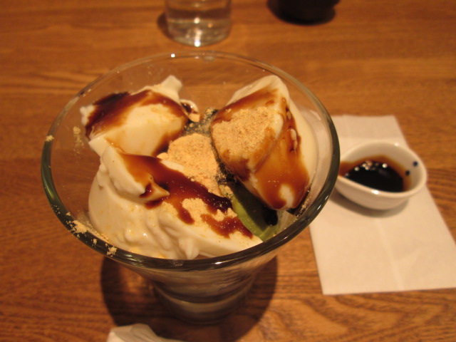 デザート、とろとろブランマンジェと抹茶アイスと小豆に黒蜜!