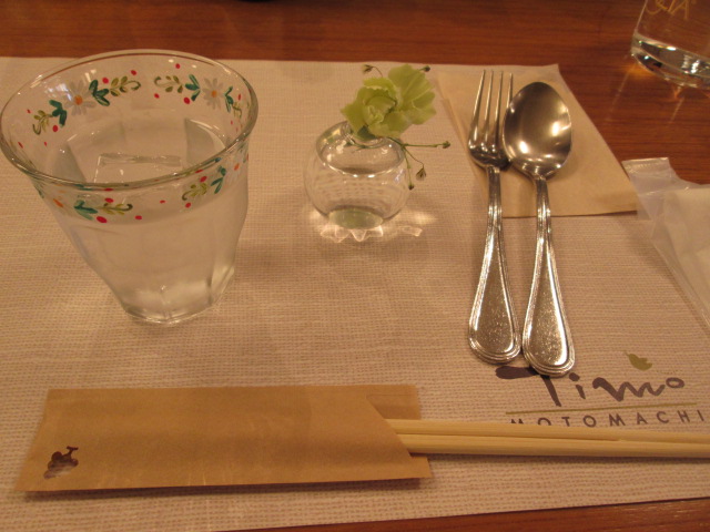 可愛らしいロゴと鳥のマット、お花、お冷やグラス、そして箸袋v