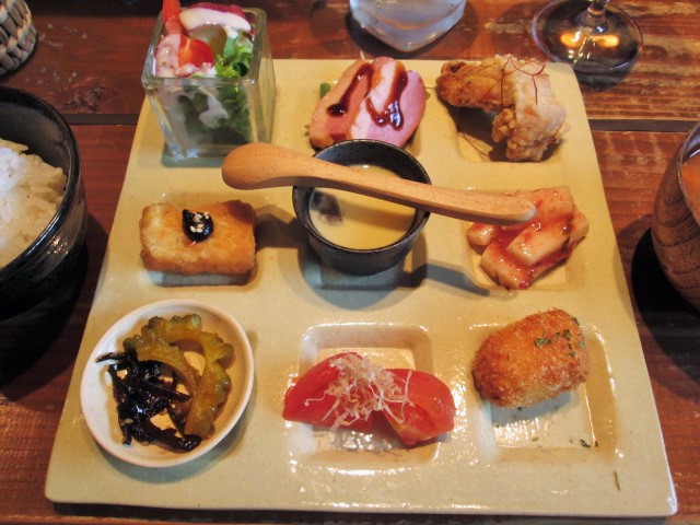 左上から、サラダ、蒸した鴨、鳥のからあげ、