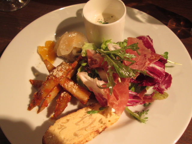 前菜は、生ハムのサラダ、フリッタータ、ごぼうのアラビアータ、