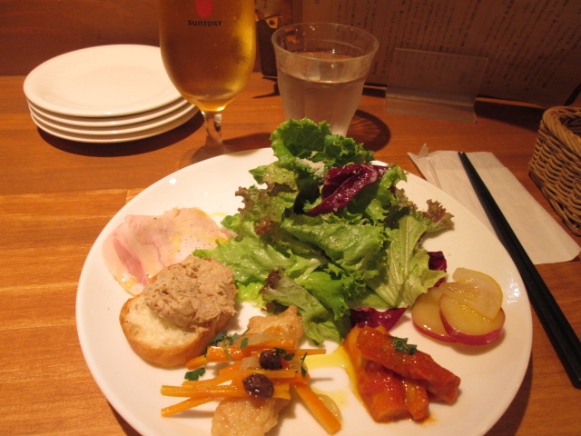 前菜は、グリーンサラダ、さつまいものレモン煮、ごぼうのアラビアータ、