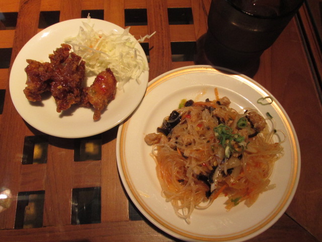 まず、すっぱからい春雨サラダ、甘酢がかかったような鶏から!