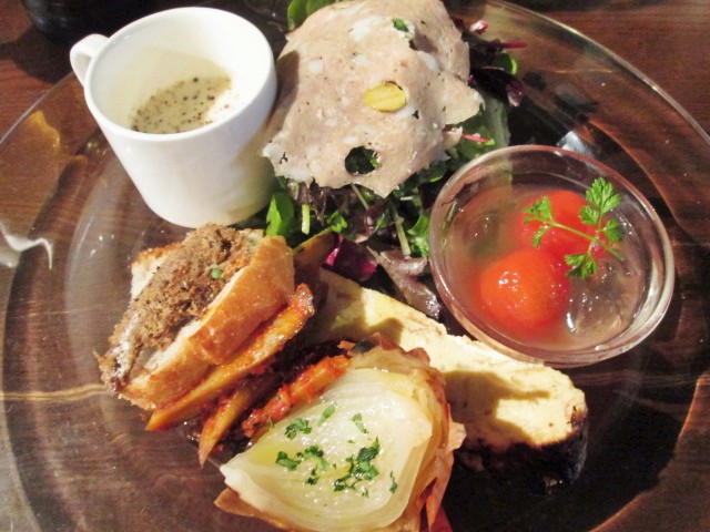 玉ねぎのロースト、アラビアータ、リエット、ヴィシソワーズ。