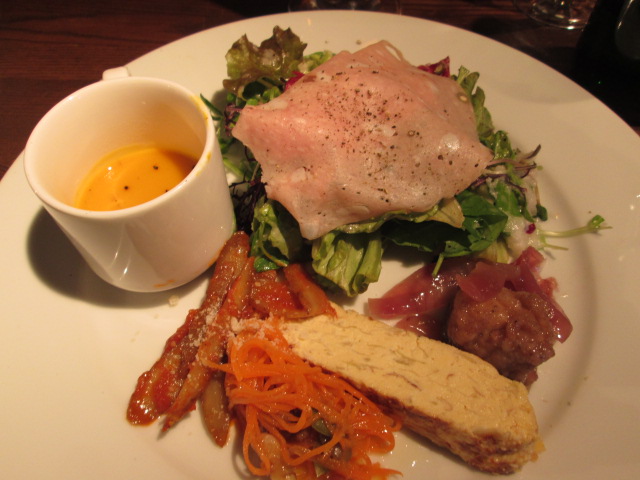 モルタデラハムのサラダ、鯖のアグロドルチェ、フリッタータ、