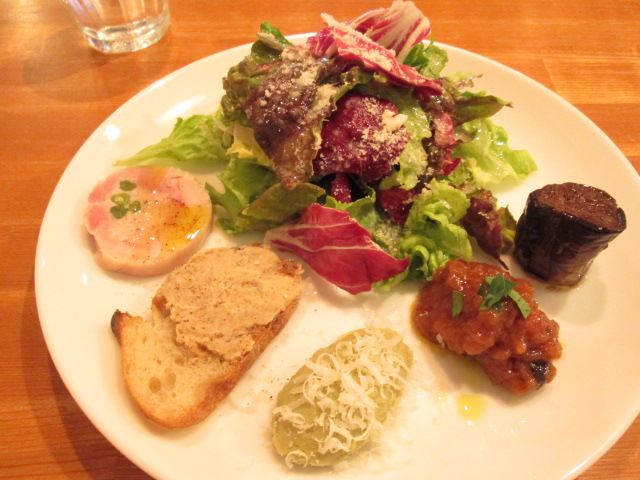 前菜は、グリーンサラダ、なすのマリネ、イイダコのトマト煮、