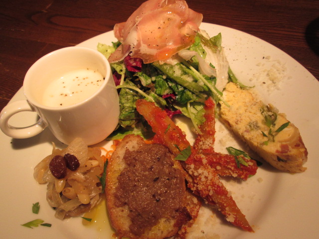前菜は、グリーンサラダとプロシュート、フリッタータ、リエット、