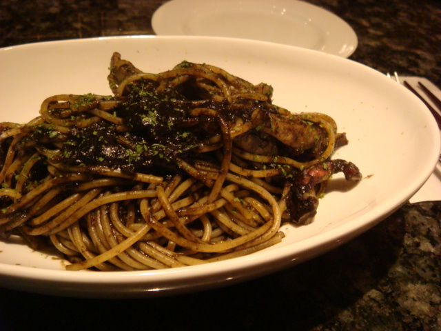 キール、チャーム、いか墨のパスタ、グリーンバナナバック。