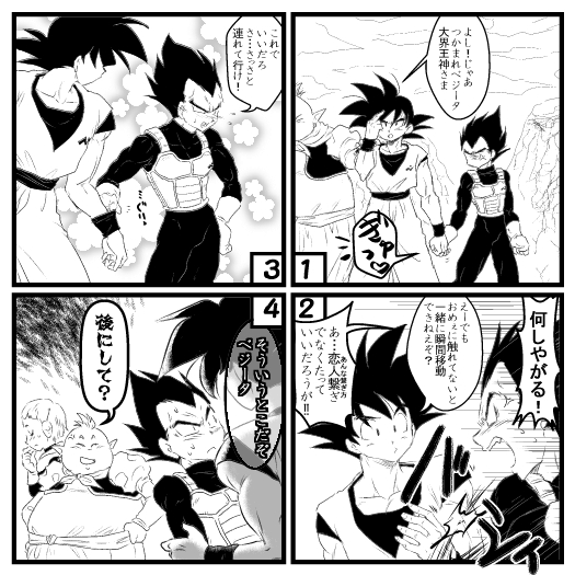 『DRAGONBALL』より、孫悟空、ベジータ、大界王神様、メルス。