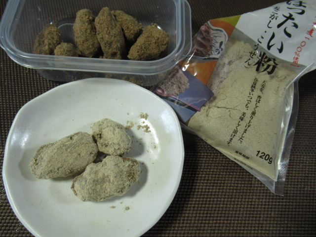 きな粉をまぶす予定が、ちょうど切らしていたのではったい粉まぶしてみた。