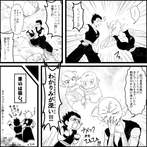 『DRAGONBALL』より、ピッコロさん、孫悟飯、デンデ、エスカ(、モロ)。