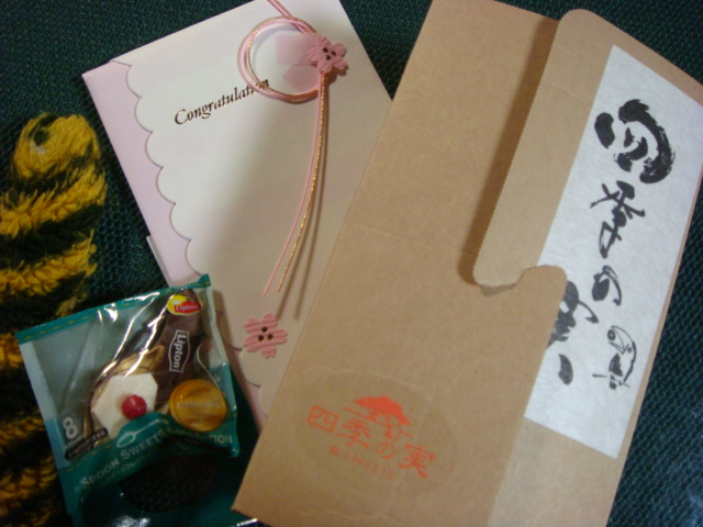 写真は姉者からのお土産と、叔母からのお祝いとこないだYちゃんに貰ったストラップ、