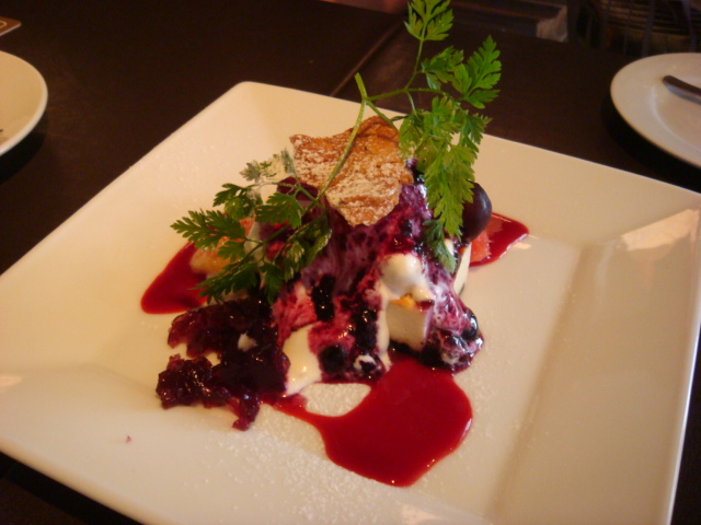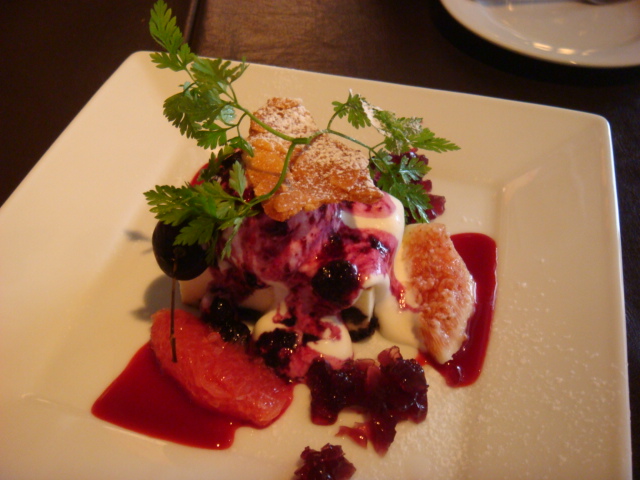 アーモンドのパイと、フルーツはいちじく、ピングレ、アメリカンチェリー。